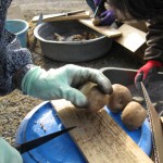 ②切った「種いも」に灰を付ける人 ※灰を付けることで腐りません。