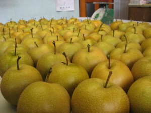 収穫した梨は作業場に持ち帰り検品を行います。もちろん形の良い物ばかりではありませんから・・・。