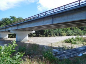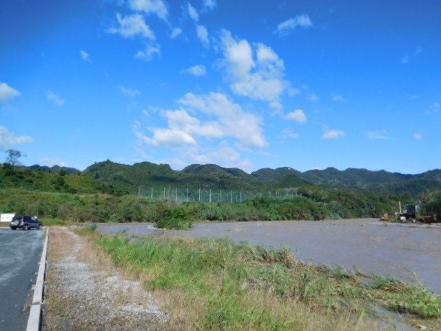 画像右側/普段は、奥の橋桁まで歩いて行ける場所。今朝は、駐車場の下まで増水していました。※赤平川
