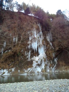 近くに行くと地層から染み出る水分が凍って氷柱になっています。